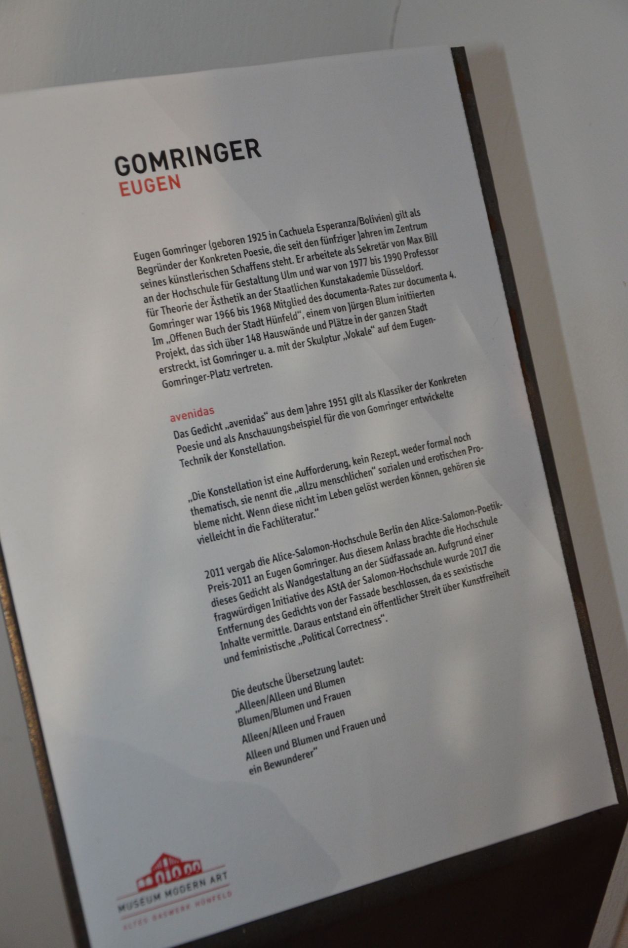 The father of concrete poetry, Eugen Gomringer, passed away in August 2025 at the age of 100. Since its founding, the internationally renowned artist maintained many connections to the Museum Modern Art in Hünfeld. He was close friends with its founder, Jürgen Blum Kwiatkowski, which is reflected in Gomringer's “Ode to Jürgen Blum” on a building facade at the Großenbacher Tor in Hünfeld.